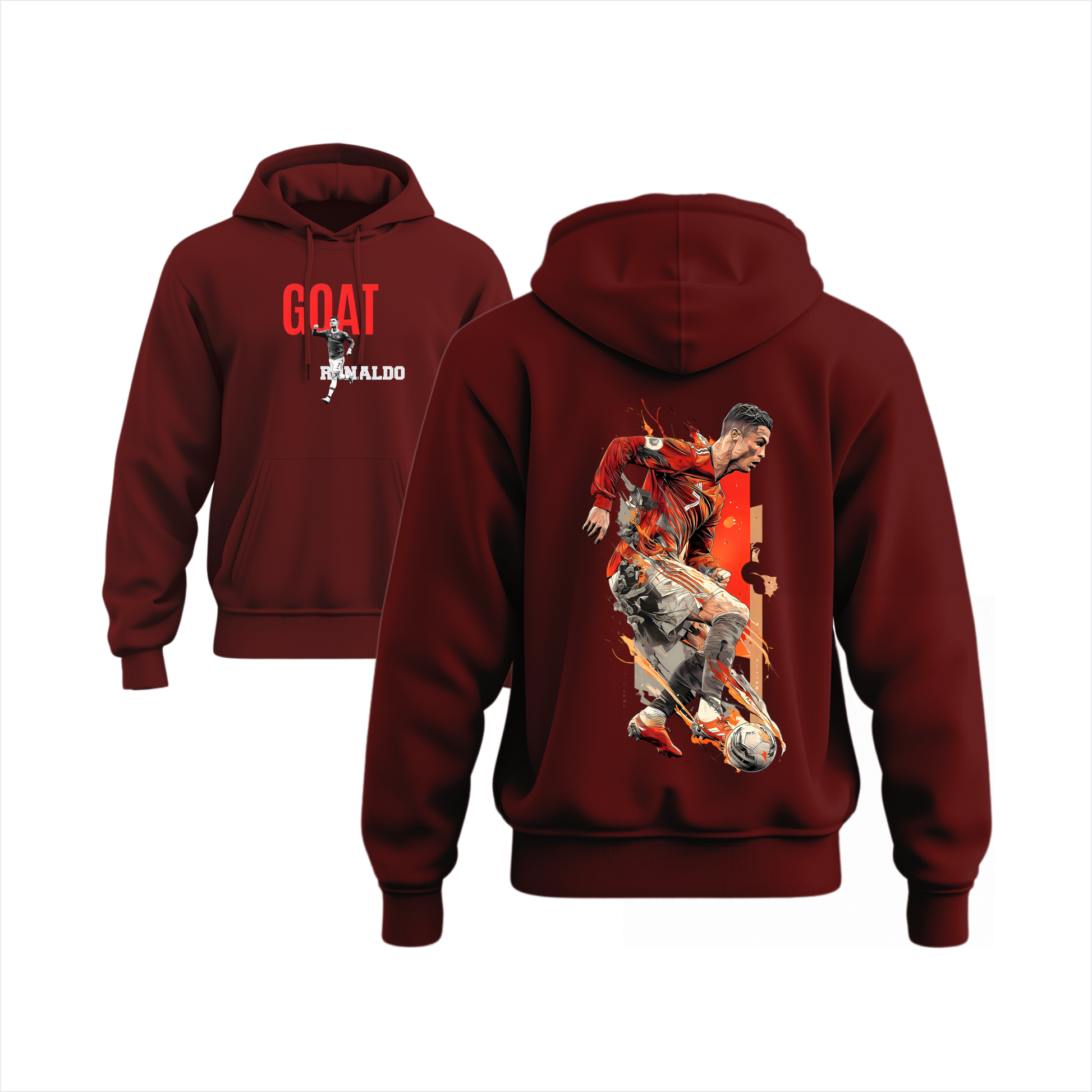 GOAT Ronaldo Boys Hodie Front & Back Celebrate your football hero with this bold boys hoodie featuring iconic Ronaldo imagery on both front and back. Perfect for young fans who want to show their passion for the beautiful game, this comfortable hodie combines style with spirit. Whether heading to the pitch or hanging out with friends, it's the ultimate tribute to greatness. Soft, durable, and designed for active kids who dream big.